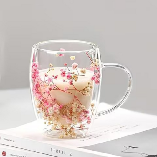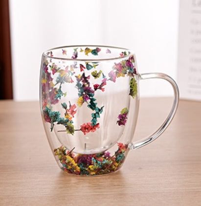 Borosilicate Double Wall Flower Glass Coffee Cups with Handle 350 ML