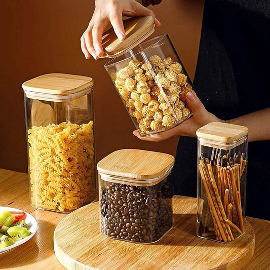 Square Food Storage Jar With Airtight Bamboo Lid, Set Of 6