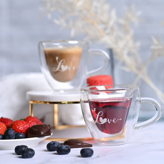 Double Wall Heart-Shaped Glass Mug Set – 180ML (2 Pcs) – ‘Love’ Printed Design with Handle – Romantic Gift for Valentine’s, Anniversary & Special Occasions