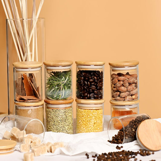 Borosilicate Round Glass Spice Jar With Bamboo Lids and Chalk Board Labels 180 ML( Pack of 10)