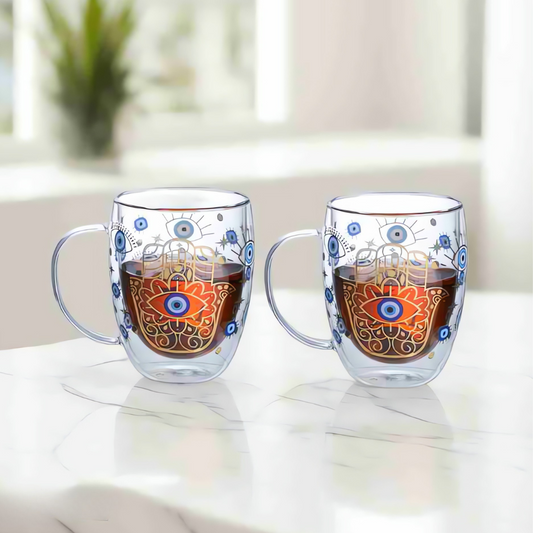 Evil Eye Double Wall Glass Coffee Mugs – 350ml, Set of 2 | Insulated Heat-Resistant Cups for Hot & Cold Beverages