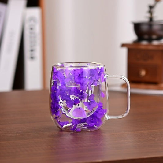 1CHASE Borosilicate Double Wall Coffee Cup Set – 250ML (2 Pcs) – Delicate Dried Flower Design with Immortal Flowers (Pink & Purple) – Elegant Gift for Valentine’s, Anniversaries & Special Moments