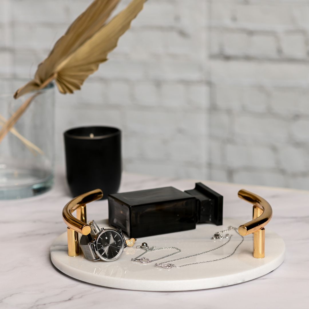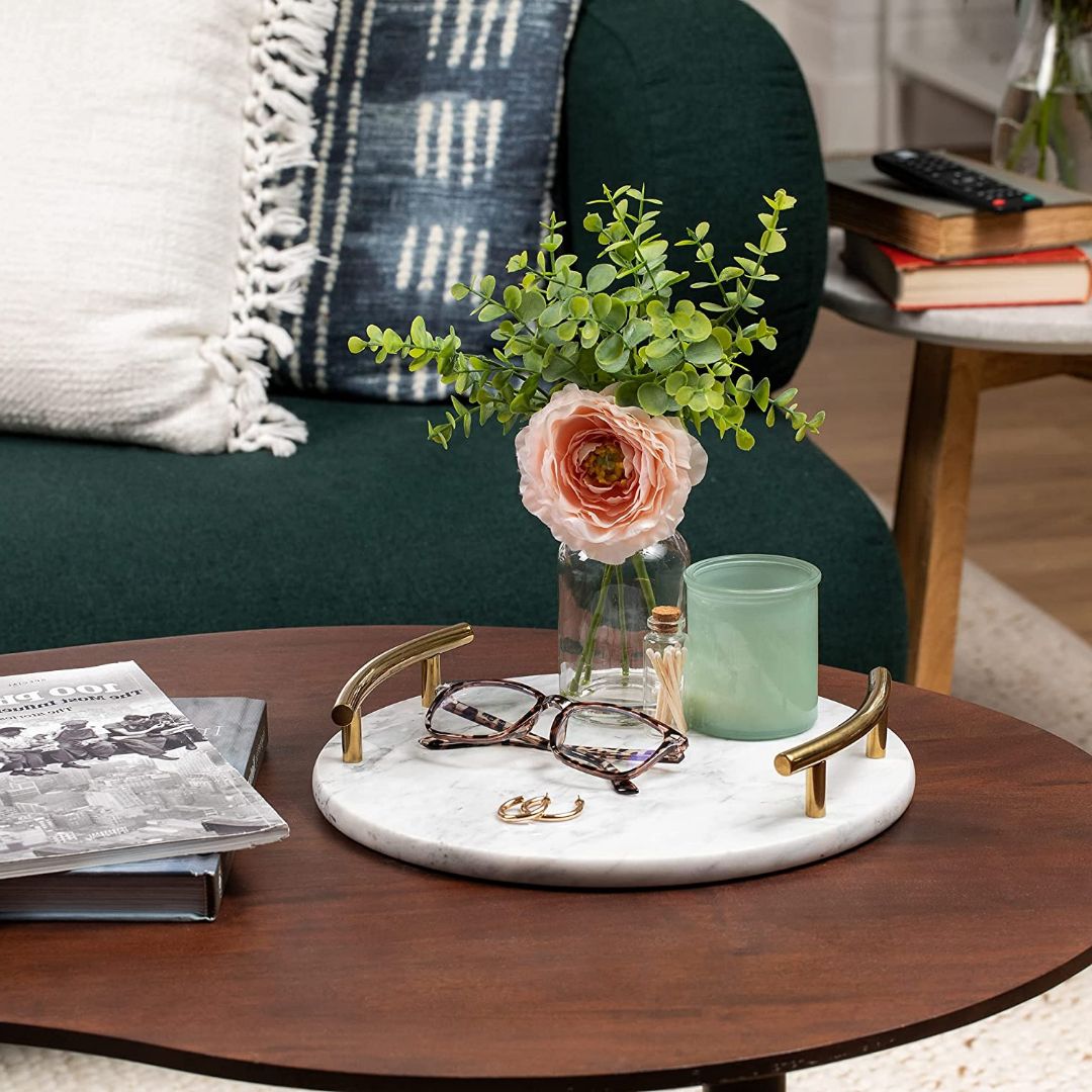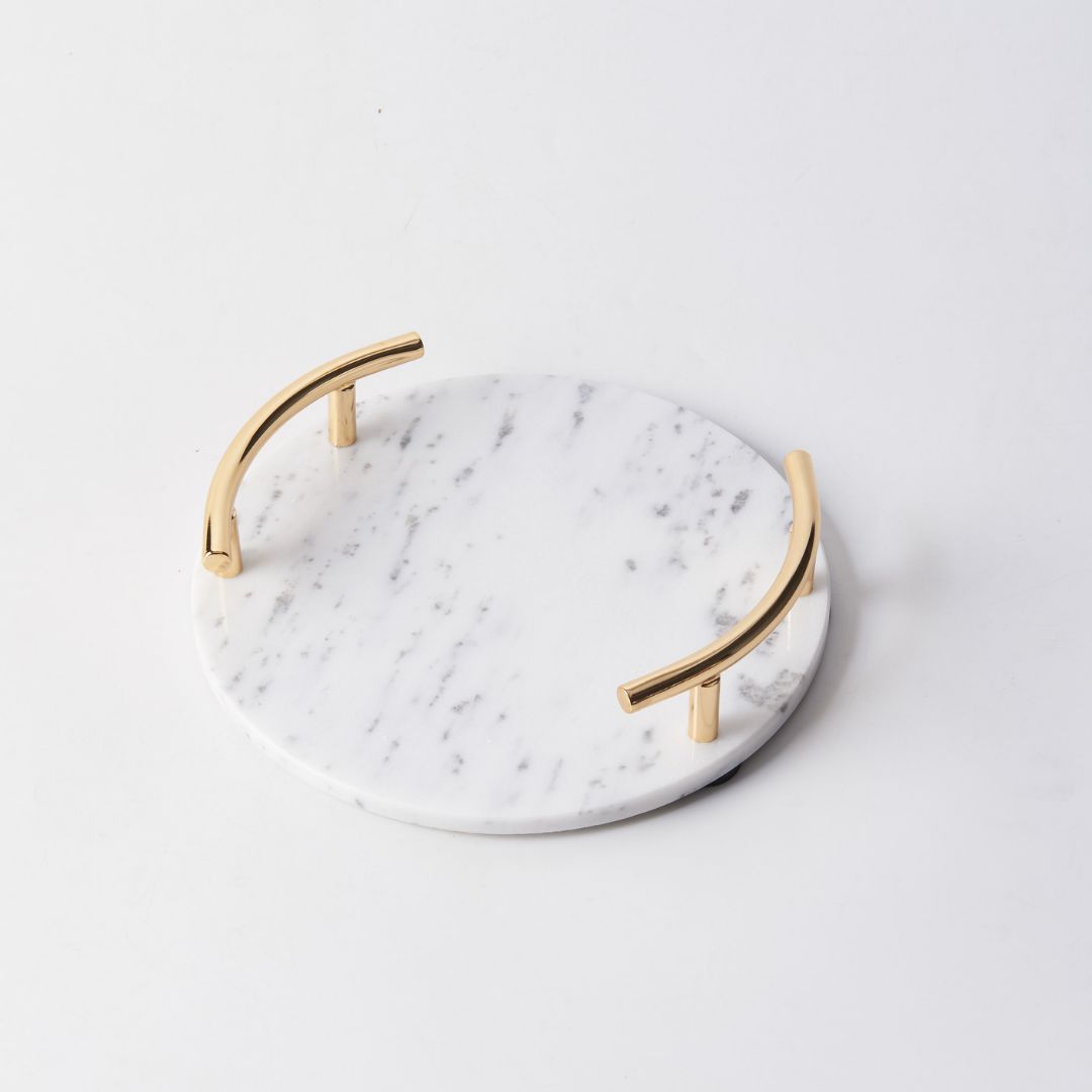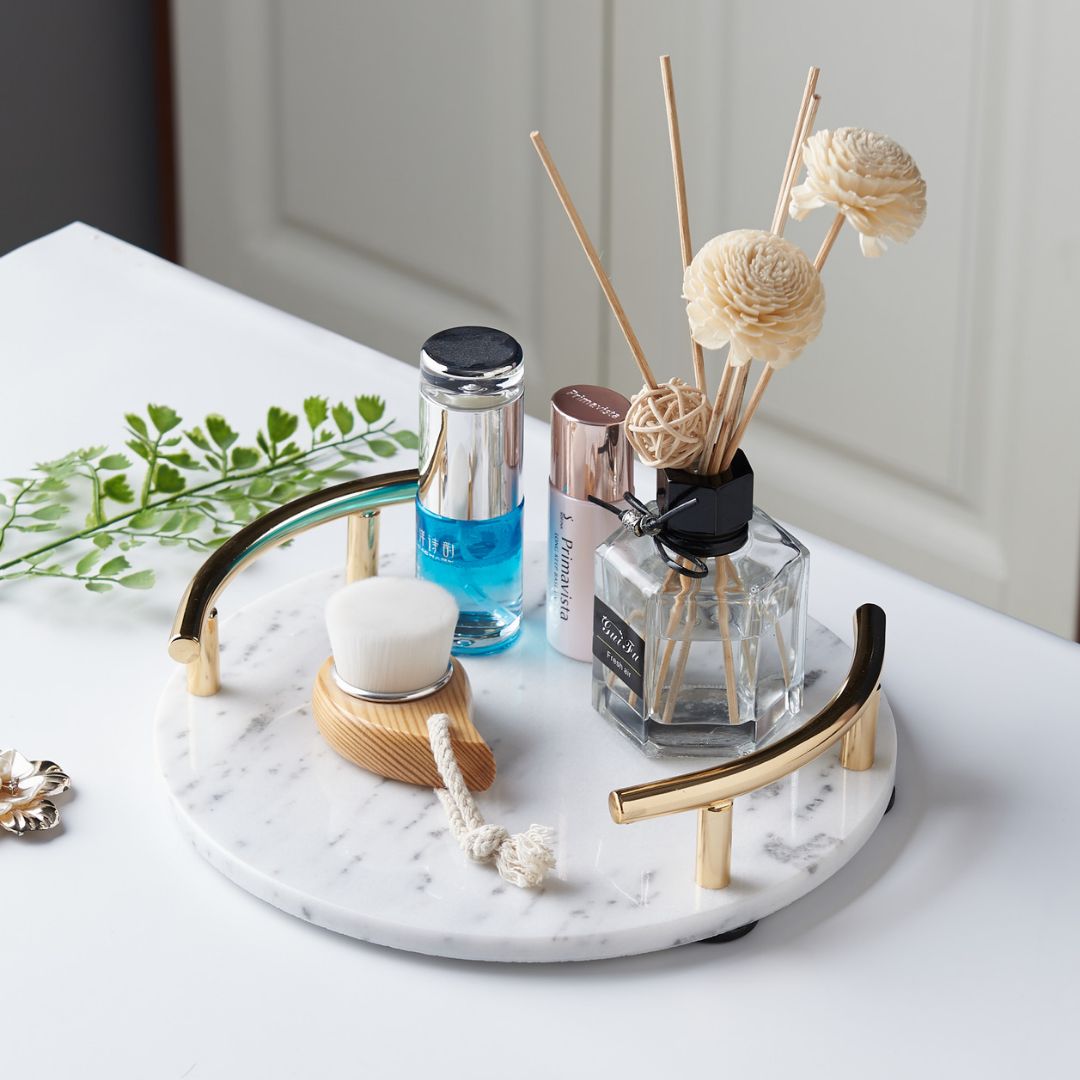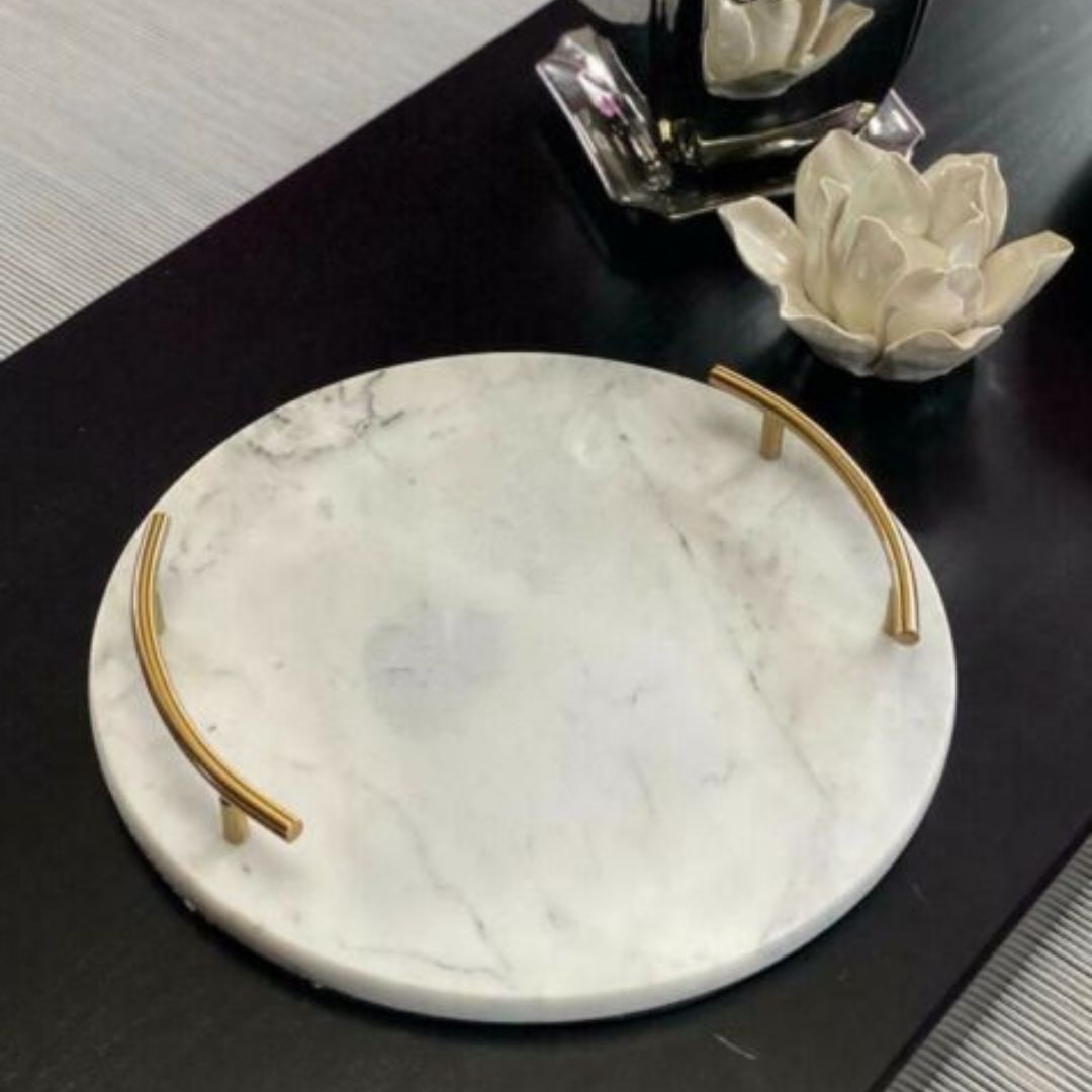 1CHASE unique Vintage-inspired white round marble serving tray with modern brass gold handles for centerpieces at your next party or for displaying cosmetics in your bathroom or bedroom.